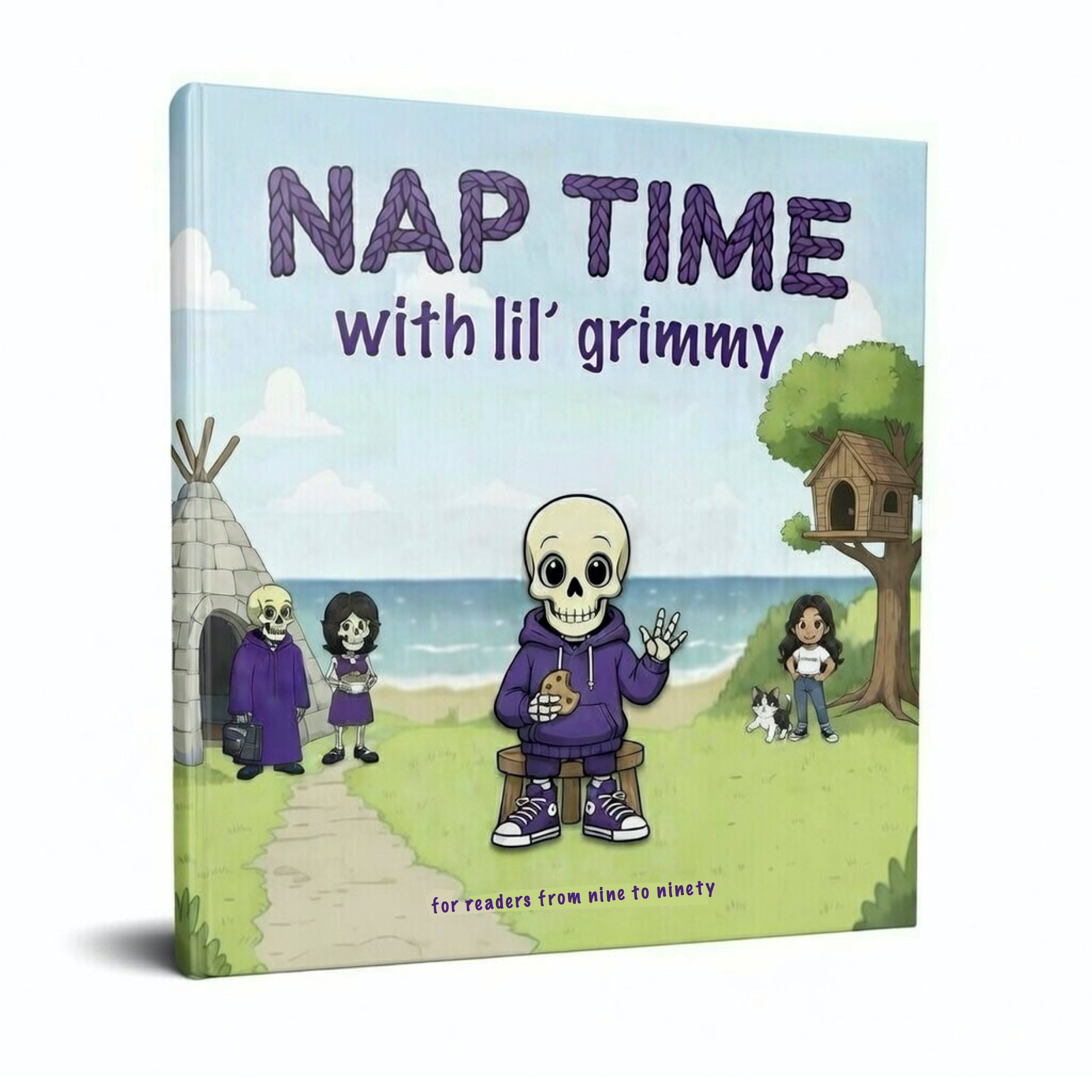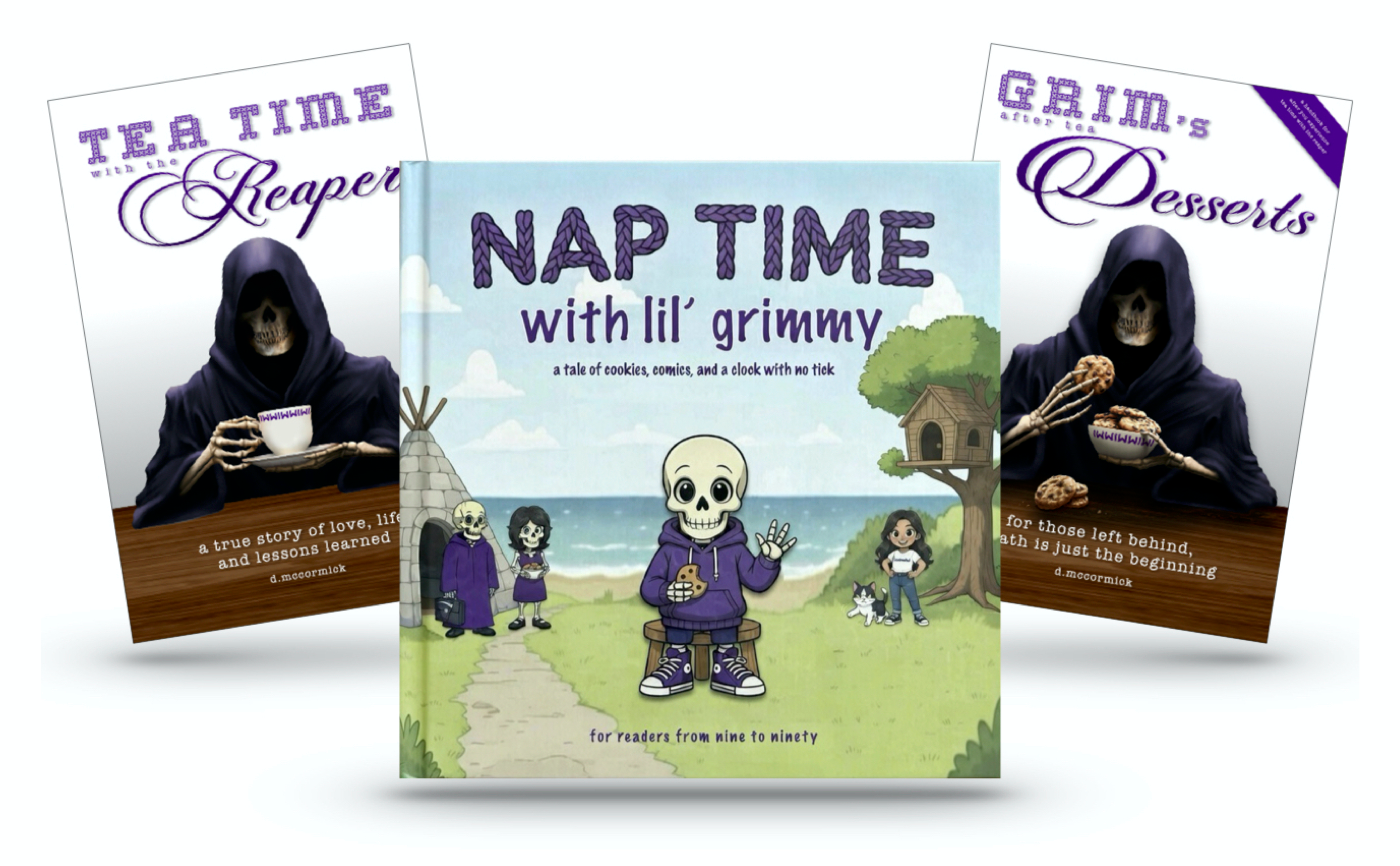 tea time with the reaper chronicles the nine years and four months Angela and i shared together — from the moment we met to the moment she died. sharing our love story opened the floodgates. people began reaching out with their own stories of death and the chaos left behind. those conversations became the tea time with the reaper podcast, and many of the collected lessons were compiled in grim’s after tea desserts. yet it became clear those lessons were rarely reaching the people most open to them — the younger generation. this led to nap time with lil’ grimmy — a children’s book written for readers from nine to ninety, meant to help us face the inevitable before it’s too late.